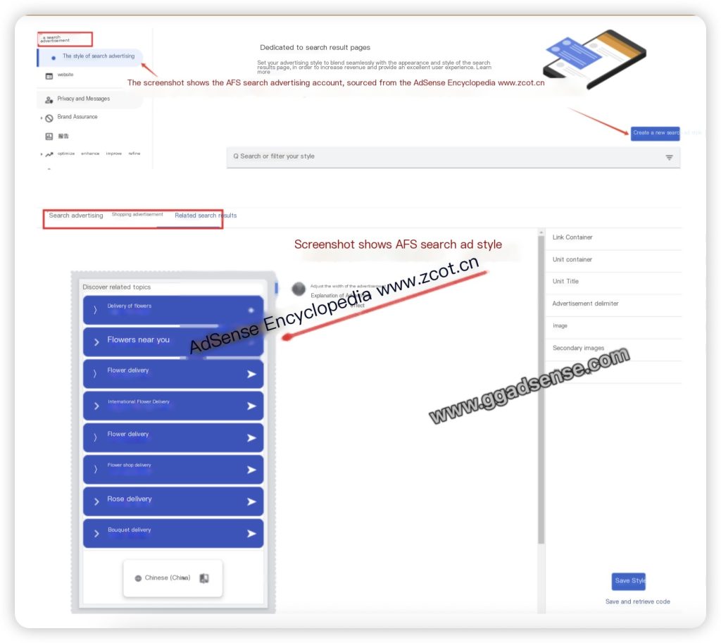 The craze for AFS search arbitrage has passed. Obviously, most people can’t win, and they can’t make money by buying traffic. Under the last wave, it is necessary to correct a fact. There are two types (or three) of AdSense search advertising accounts. The real AFS search ads are shown in Figure 1-2 below. The search ad style can be customized, supporting three formats: search ads, shopping ads, and related searches. This genuine AFS function account has long been out of print. In the past ten years, Google has never officially opened the application entrance in public channels. As shown in the figure below